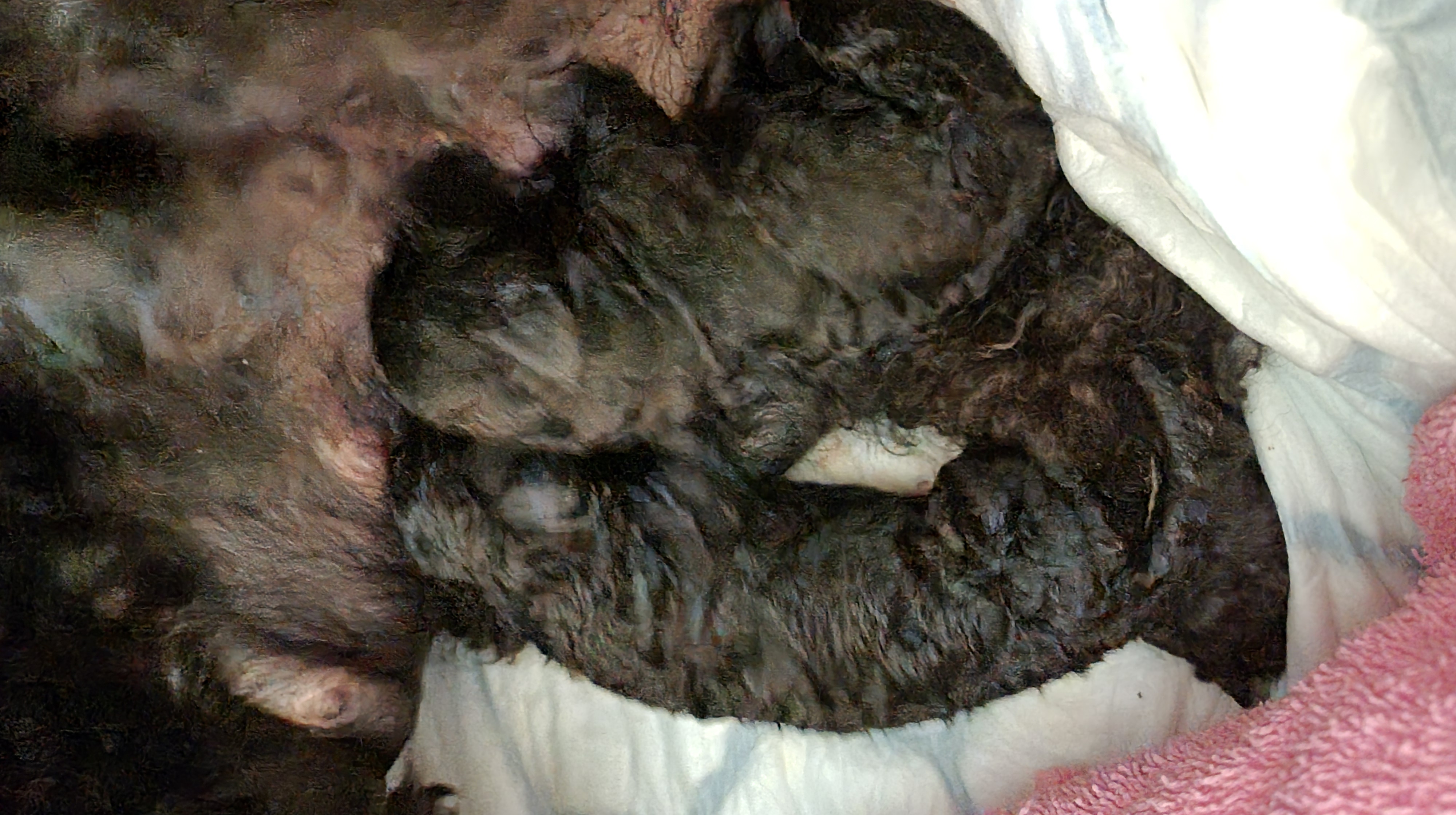 Så her ligger de i valpekassa som min far har bygd – den ble nå bygget om fra storpuddel til mellompuddel. Kassa er satt opp på en hundemadrass fordi det kan være gulvkaldt.