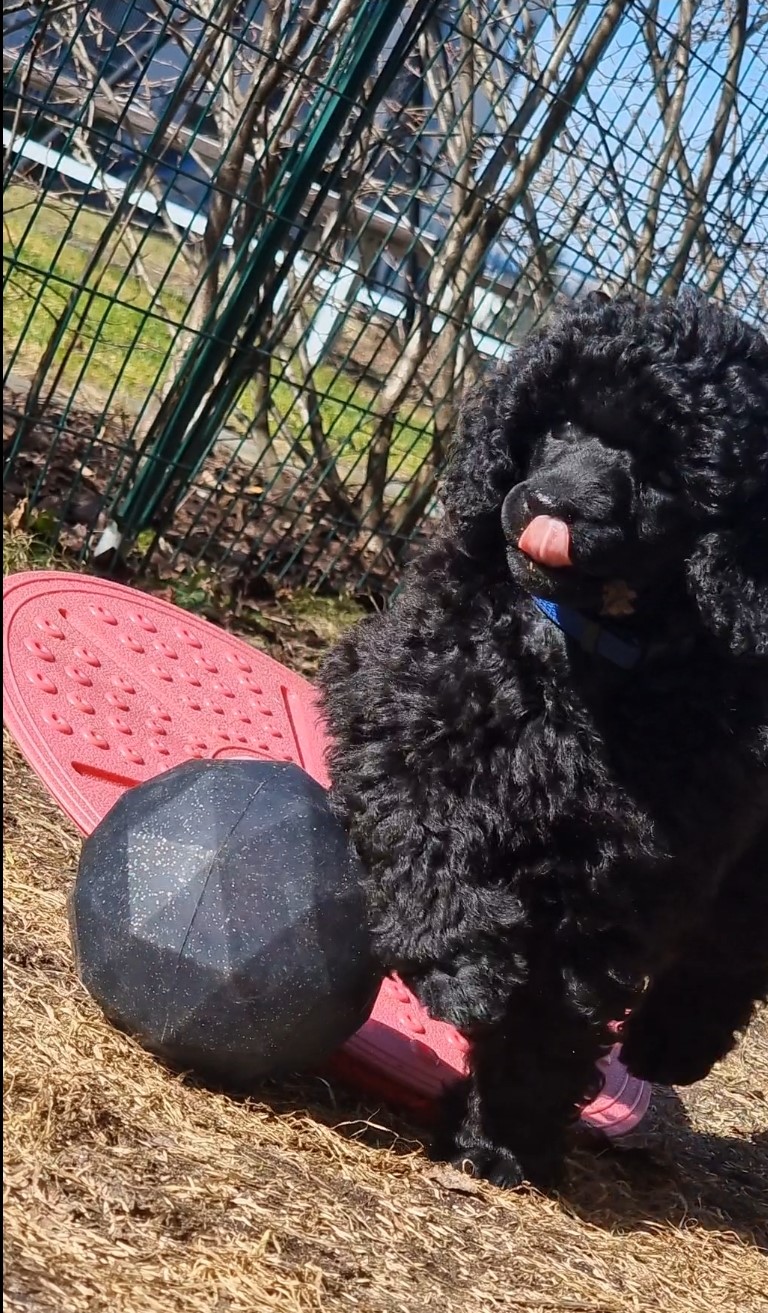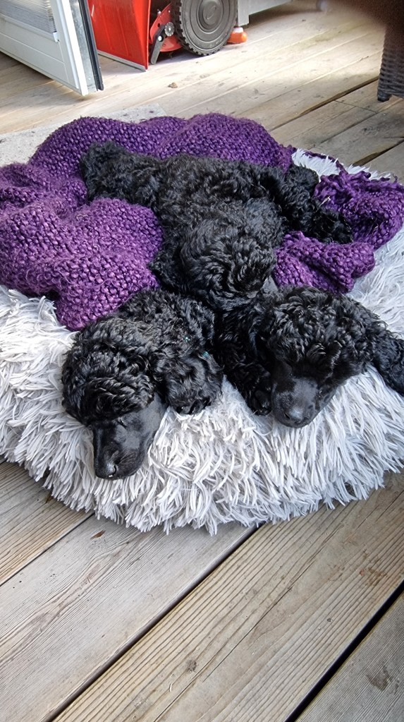 Jeg koser meg så mye med valpene. Ser de lærer nye ting hele tiden. De er blitt veldig flinke på bitekontroll, og oppfører de seg ikke så er mor Ine rakt på pletten. Den førstefødte, men minste har foreløpig fått navnet Sky (Viking – som kallenavn) og den største gutten heter Spirit. Sist fødte og minst er tispa som på stamtavla heter Angel – men går for «Tutta» foreløpig. Sky har turkis halsbånd, Spirit har mørkeblå og Tutta har rødt.